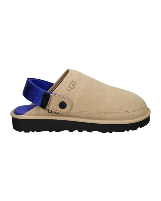 UGG Goldencoast II Suede Clogs combine a soft suede upper with an adjustable Velcro strap for easy on/off wear and everyday comfort. Key attributes: Beige | Blue | Suede | Adjustable strap with Velcro closure | Rubber sole | Clog silhouette | Suede upper | Embossed UGG logo | Dimensions & fit: Size 42 | Composition & care: 100% leather | 100% rubber Colour: blue