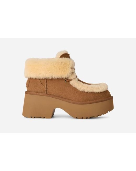 Bringing beauty and grace to a whole new level: it's our Esmee Lace Up. This evolution of our Classic Boot reimagines UGG® elements in a fashion-forward lens. Designed with a suede upper and a lush sheepskin spill seam, it has a cuffable collar that can be folded to expose even more sheepskin goodness. The interior features our soft UGGplush™ lining while the 2.75' platform outsole is crafted with sugarcane EVA to keep things light. | UGG® Classic Esmee Lace Up Boot in Brown, Size 6, Suede/Polyester/Cotton