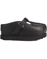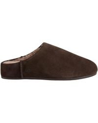 Go to YOOXMules, leather, plain colour, brand logo, fabric inner, velcro fastening, round toe, flat, rubber sole, contains non-textile parts of animal origin. 100% leather. Colour: brown