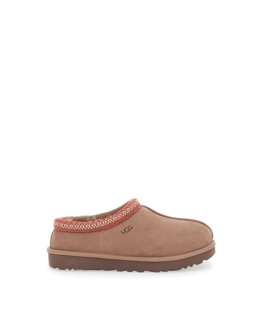 Step into comfort and style with these brown UGG Tasman II slippers for women. Featuring an embroidered braid detail, slip-on design, suede upper, and plush sheepskin interior. The durable Sugarcane EVA outsole allows you to wear them indoors and outdoors. Stay cosy with the sheepskin and wool lining. Complete with a heat-embossed logo on the side.. UGGs feel snug at first, but the lining expands with wear. We recommend your usual size. Colour: brown