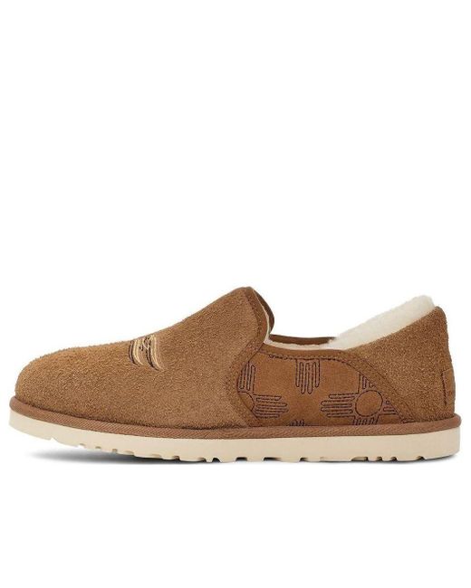 Cosy chestnut suede shoes with embroidery and metal accents. Features UGGplush™ lining and sockliner (60% upcycled wool), a foam footbed, and Treadlite by UGG™ outsole. Recycled materials used. Colour: brown