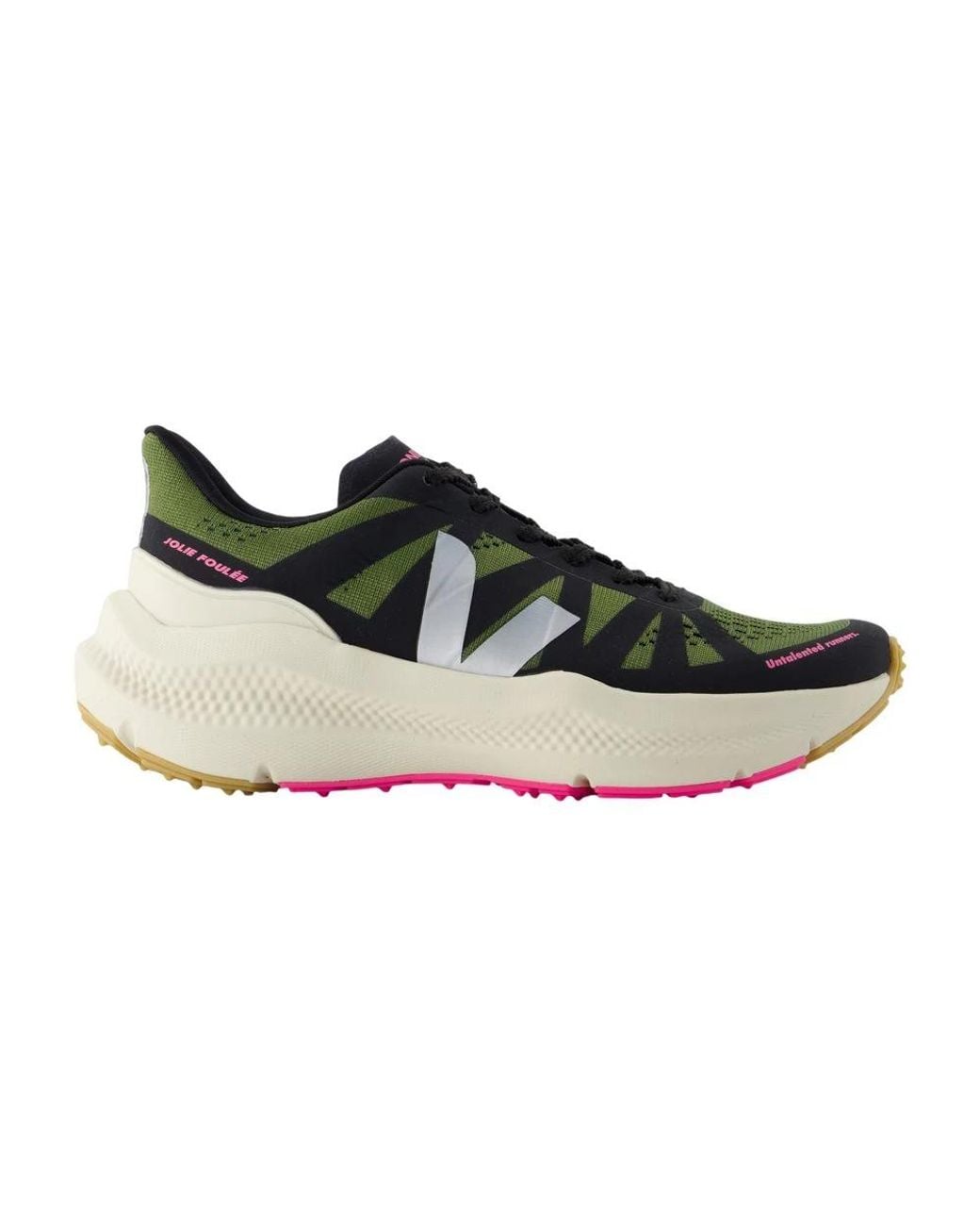 Veja Condor 3 Advanced trainers combine running-focused performance with stable support. This collaboration with Jolie Foulée features an engineered mesh upper and a dynamic stability plate for breathable, supportive wear. Key attributes: Multicolour | Green | Militar refletivo | Fabric, Mesh | Breathable engineered mesh upper | Dynamic stability plate for support | Cushioned midsole for impact absorption | Durable rubber outsole for traction | Lace-up closure | TPU overlays for structure | Ankle-height profile | TPU V-logo detail | Contrasting panel construction | Dimensions & fit: True to size | European sizing | Composition & care: Upper: Engineered mesh (polyester) | Overlays and logo: TPU | Insole: Eva, polyester | Midsole: EVA and rubber | Outsole: Rubber Colour: black