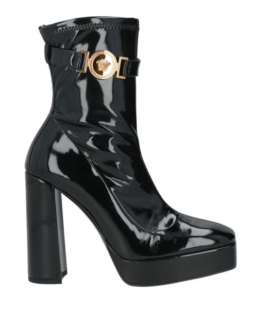 VERSACE. jersey, patent-effect, brand logo, plain colour with appliqués, unlined, square toe, square heel, leather sole, contains non-textile parts of animal origin, chunky boots. Textile fibres.
