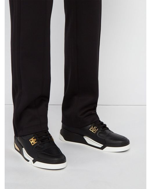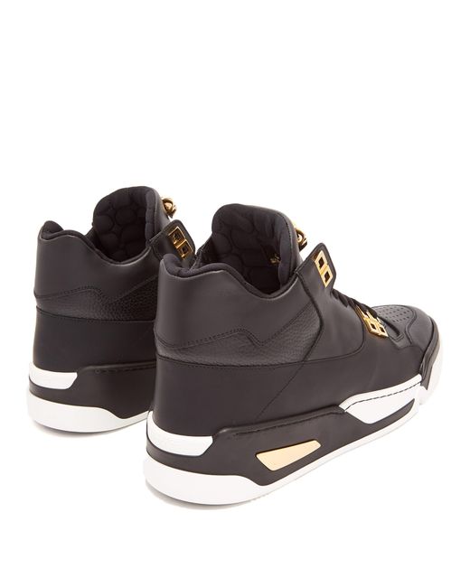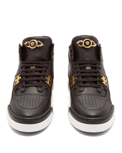 High-top buffed calfskin sneakers in black. Perforated detailing at round toe. Tonal lace-up closure. Medusa hardware at padded tongue. Padded collar. Logo embossed at heel. Rubber midsole in black and white with metal trim. Gold-tone hardware. Tonal stitching.
