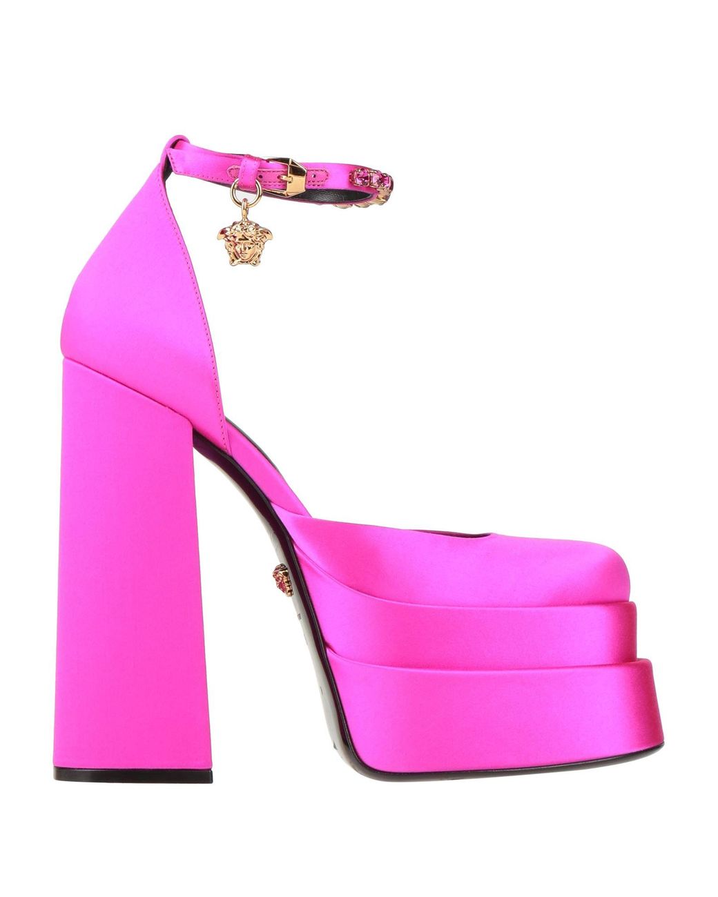 VERSACE. satin, crystals, brand logo, plain colour, leather lining, buckle-fastening ankle strap, square toe, square heel, leather sole, contains non-textile parts of animal origin, ankle-strap pumps. Textile fibres.