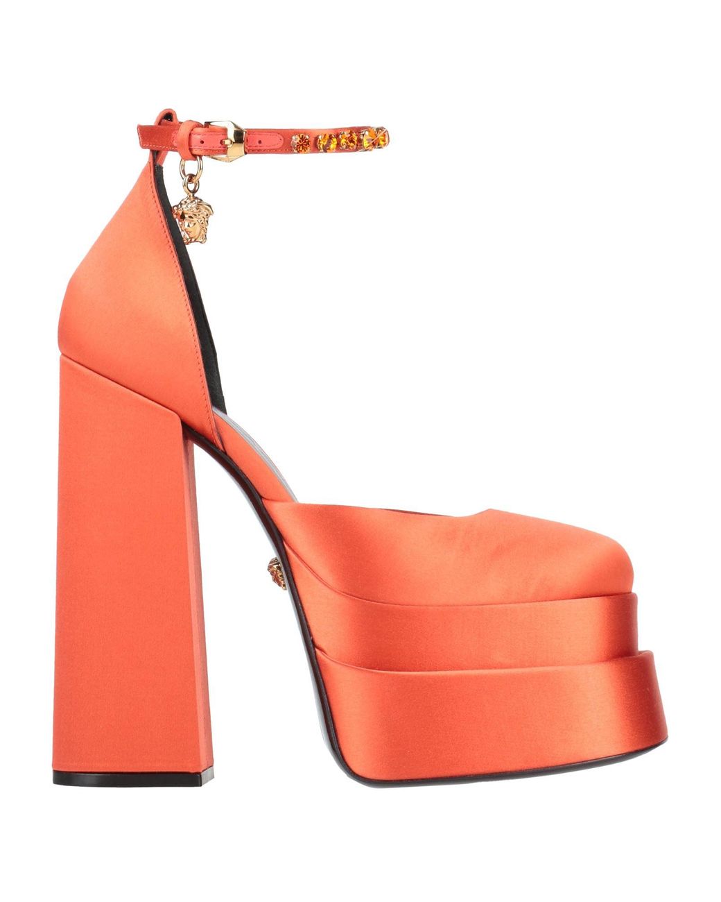 VERSACE. satin, leather, nappa leather, rhinestones, brand logo, solid colour, leather backing, wrapping straps closure, narrow toeline, square heel, covered heel, covered wedge, leather/rubber sole, contains non-textile parts of animal origin, ankle-strap courts. Soft Leather, Textile fibres.
