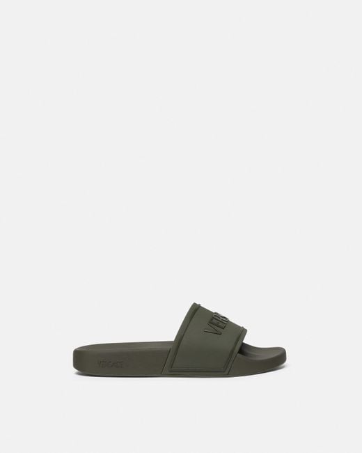 Rubber sliders featuring a Versace logo embossing on the uppers. Colour: green