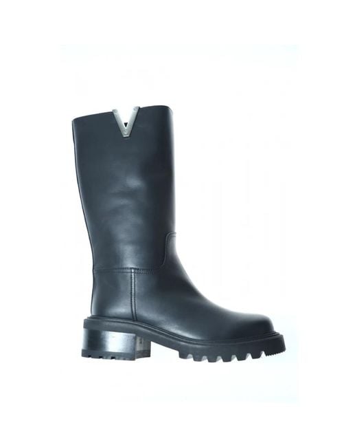 Via Roma 15 Biker is a leather ankle boot defined by a silver 'V' logo and tank-tread rubber sole. It pairs a modest 5 cm heel with a sturdy construction for everyday city wear. Key attributes: Black | Leather | Slip-on (no closure) | Rubber tank-tread sole | Silver 'V' logo on shaft | Rounded toe | Visible stitching details | Dimensions & fit: Heel height: 5 cm | Shaft height: 29 cm | Regular fit (true to size) | Composition & care: Upper: leather | Lining: leather | Sole: rubber Colour: blue