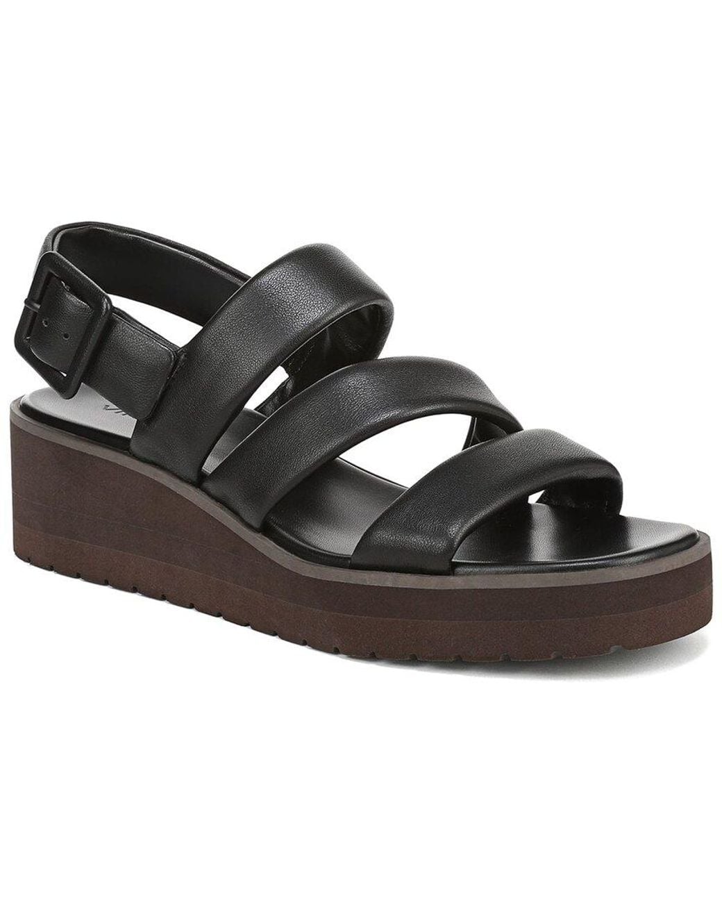 About the brand: Inspired by the natural beauty of California, Vince is a master of simplicity and laid-back staples. From understated knitwear to tailored essentials, Vince's casual cool vibes are simply timeless. Skylar Sandal in black leather. Design details: Strappy platform sandals finished with unmatched comfort and a buckled slingback strap. Leather upper and lining responsibly sourced from Leather Working Group certified tanneries material. Slingback strap with adjustable buckle closure. Open toe. Wedge heel measures 1.75Ó. Professional clean only. Slingback leather lining Rubber sole 1.75in heel Imported Colour: black
