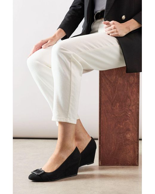 - Wide Fit Darwin Faux Suede Almond Toe Covered Buckle Medium Wedge Court Shoes