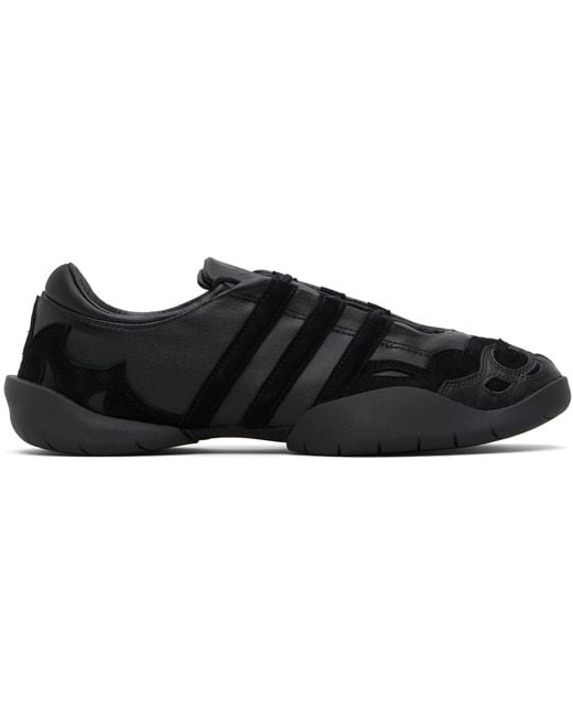 Low-top buffed leather and goatskin suede trainers. · Graphic appliqué at vamp and heel counter · Lace-up closure · Logo embossed at vented tongue · Padded collar · Signature stripes at sides · Treaded rubber sole Supplier color: Black/Black/Black Colour: black