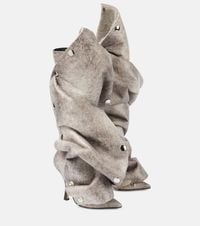 Go to SSENSEMid-calf cracked faux-leather boots in grey. · Fading throughout · Adjustable and detachable faux-shearling press-stud overlay · Pointed toe · Zip closure at heel · Buffed leather lining · Stacked leather stiletto heel