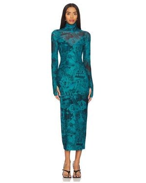 Stretch Mesh Abstract Stripe High Neck Long Sleeve Maxi Dress - Blue