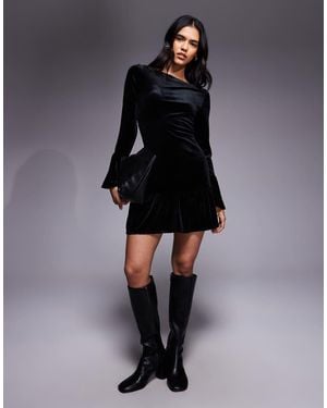 Velvet Long Fluted Sleeves Mini Dress - Black
