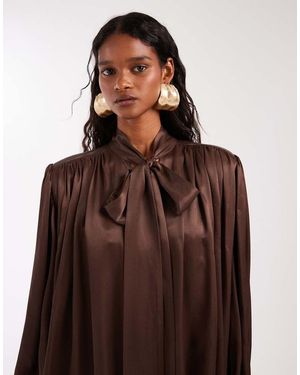 Satin Shoulder Pad Volume Gathered Blouse - Brown
