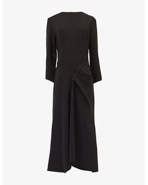 Pleated-Waist Quarter-Sleeve Stretch-Woven Midi Dress - Black