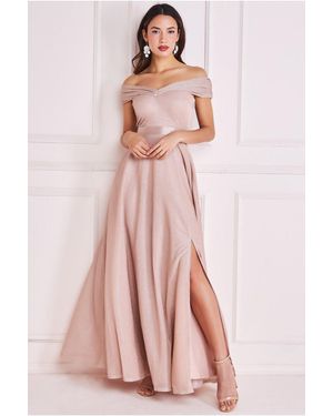 Front Pleated Wrap Off The Shoulder Corset With Tulle Gathered Midaxi Skirt Cream - Pink