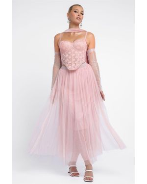 Textured Floral Mesh Corset Tulle Gathered Midaxi Skirt With Jersey Scarf & Embellished Fingerless Mesh Gloves - Pink