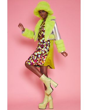 Faux Leather With Lime Faux Fur Biker Jacket Size - Pink