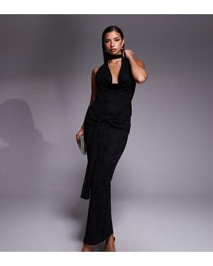 Exclusive Lace Deep Cowl Neck Open Tie Back Drape Waist Detail Maxi Dress - Blue