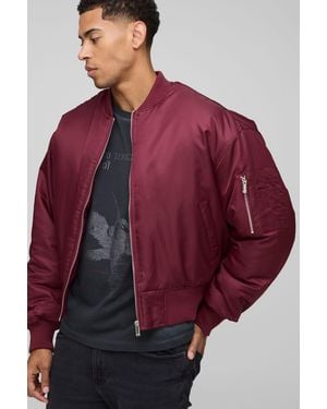 Oversized Boxy Curved Hem Nylon Bomber Jacket - Red