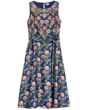 Floral Print Midi Dress With Short Sleeves And Belt - Blue
