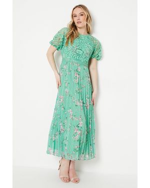 Occasion Floral Lace Bodice Pleated Midi Dress - Green