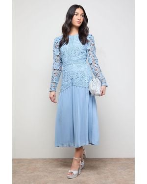 Lace Bodice Pleated Skirt Long Sleeve Midi Dress - Blue