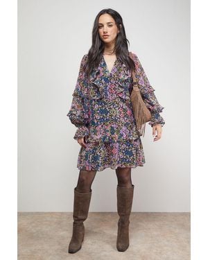 Printed Lace Detail V Neck Ruffle Mini Dress - Multicolour