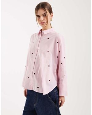 Boxy Shirt With Heart Embroidery - Pink
