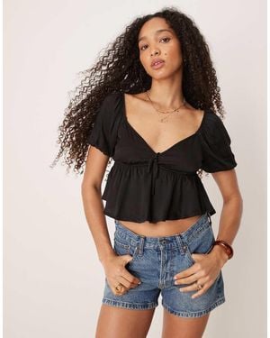 Tie Front Puff Sleeve Peplum Blouse - Black