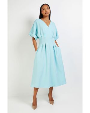 Crepe Pleat Waist Fit & Flare Midi Dress - Blue