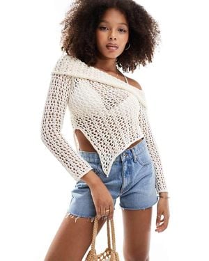 Textured Knit Bardot Top With Scarf Hem - Blue