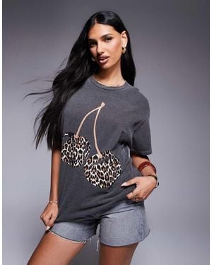 Leopard Print Cherry Boyfriend T-shirt - Grey