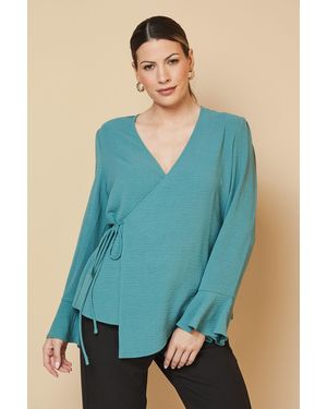 Woven Flute Sleeve Wrap Blouse - Blue